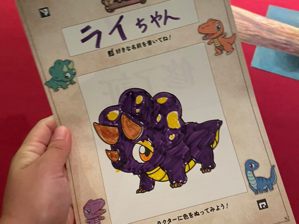 ①様々な恐竜のイラストから、気に入ったものを選んで、好きな色にぬります。