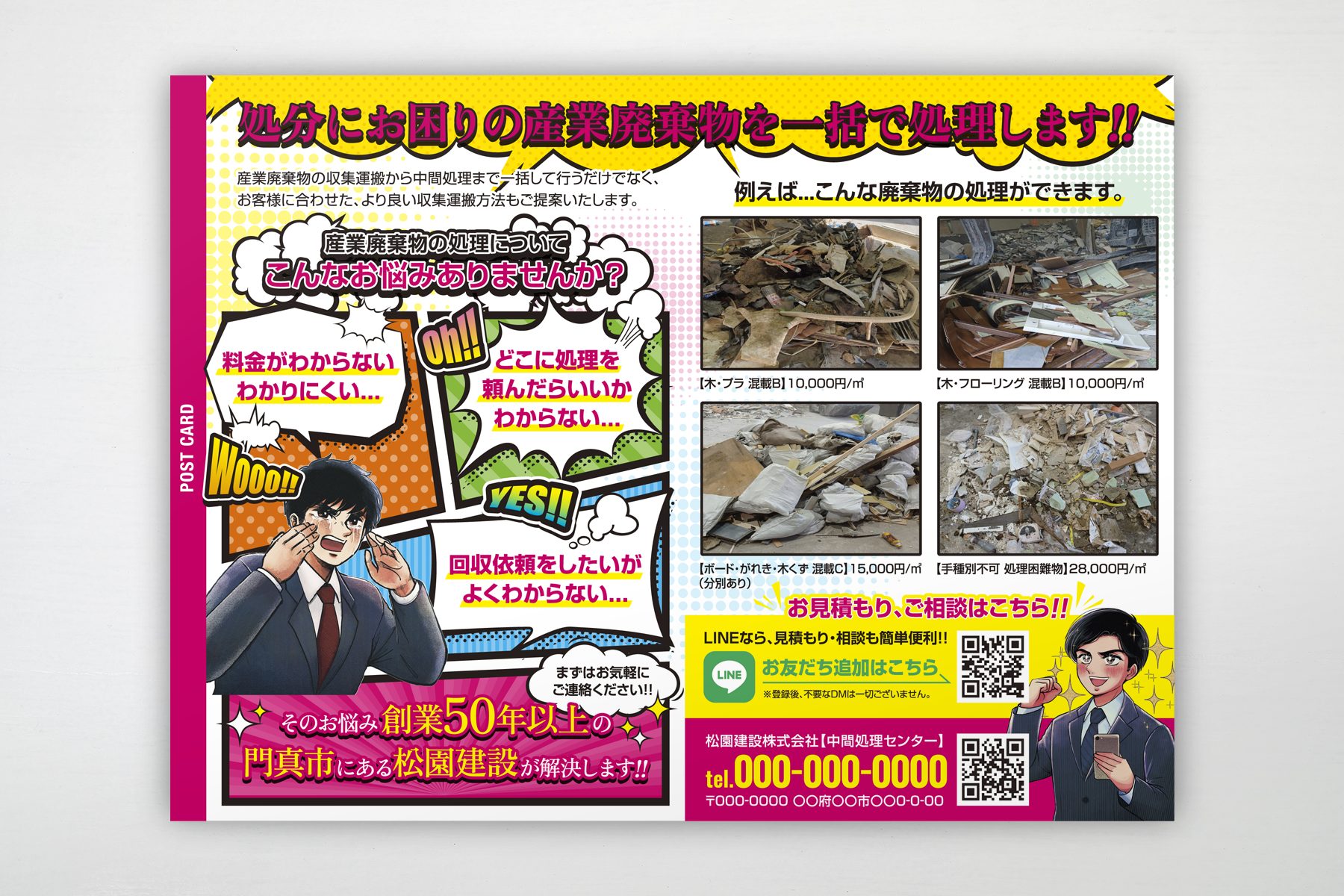 「松園建設株式会社」様のダイレクトメールを制作しました。企業の魅力やサービス内容が伝わるよう、分かりやすい情報整理と印象に残るデザインに仕上げています。