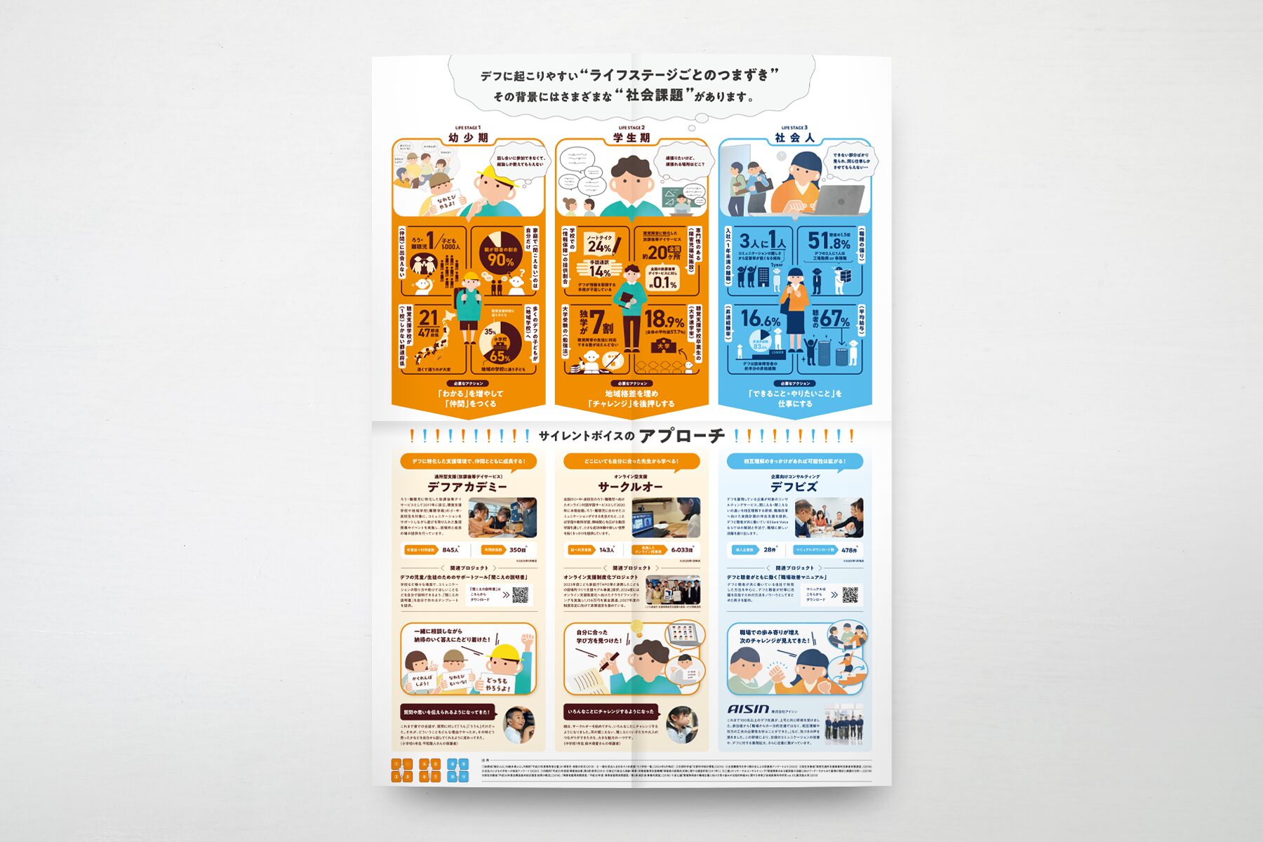 ろう難聴者(デフ)の方の支援を行うSilent Voiceさんの団体紹介パンフレットを制作しました。デフの方にどんな社会的障壁があり、その解消のためにどんな活動を行っているのか、初めて知る人にもわかりやすく伝わるよう心掛けました。
